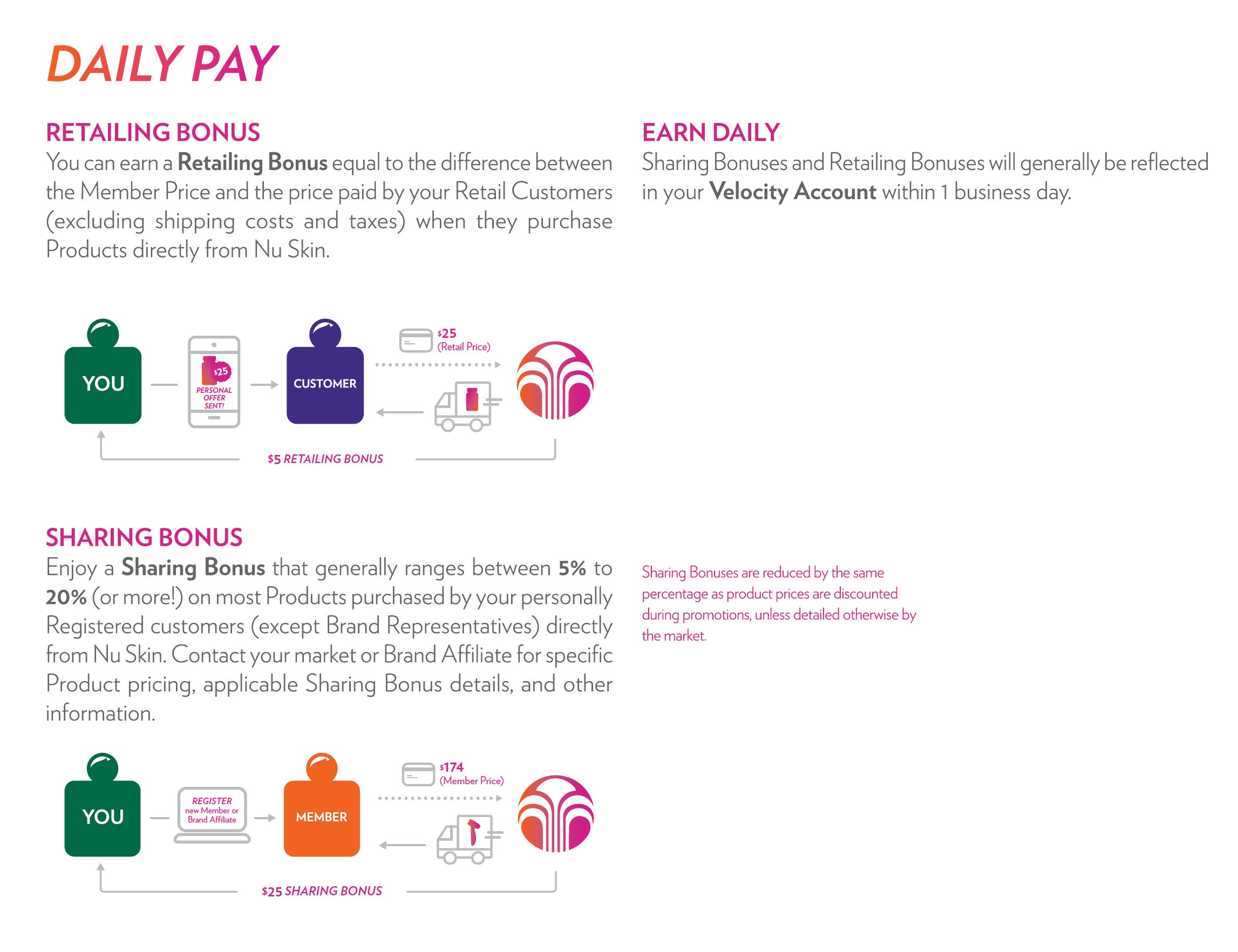 Welcome To Velocity By Nu Skin! This Flexible Program Helps You Live Life On Your Own Terms And Get Fast Rewards. You Will Earn A Sharing Bonus On All Of Your Registered Customers (Except Brand Representatives) Whenever They Make A Purchase Directly From Nu Skin.